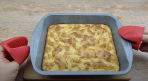 Blachę należy wyłożyć pergaminem. Na to wylać ciasto. Całość piecze się od 30 do 35 minut, w 180 stopniach.