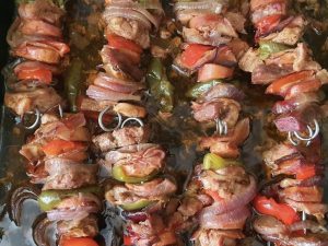 Przygotuj szaszłyki i wszystkie składniki na szaszłyki na twardej macie. Następnie nakłuwamy na przemian ziemniaki, mięso, paprykę, cebulę, boczek i ponownie ziemniaki. W ten sposób powtarzamy nakładanie warstw.