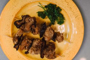 Umieść przygotowane szaszłyki na blasze do pieczenia. Natrzeć olejem.