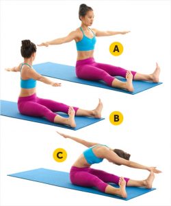 Do kolejnego ćwiczenia potrzebujesz obciążenia. Siedząc na podłodze z ugiętymi kolanami i prostymi plecami, trzymaj hantel przed sobą. Przechyl się do tyłu, wyciągając ramiona do przodu, a potem wykonaj obrót w lewo, jak najdalej się da. Następnie obrót w prawo… 30 razy. Ważne, aby ciągle napinać mięśnie.