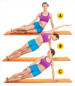 Ćwiczenie na boczki to kolejny etap! Usiądź na boku i podnieś biodra. Licz do 8-10, wyrzucając wolne ramię do góry (zrób łuk jak na obrazku). Powtórz 15 razy na każdą stronę.