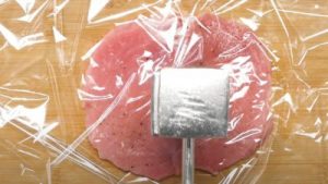 Przygotuj kawałek kotleta o grubości 2,5 centymetra. Jeśli jest na nim kość, odetnij ją i pozbądź się tłuszczu. Przekrój plasterek na pół, ale nie do końca, aby mięso było razem. Przykryj folią i rozklep na grubość 4 milimetrów. Następnie posolić i popieprzyć z obu stron.