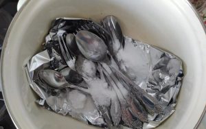 Do czyszczenia stalowych łyżek i widelców użyjemy świeżo ugotowanej wody (1-1,5 litra) i głębokiego naczynia. Na dnie naczynia układamy warstwę folii, na której kładziemy sztućce. Dodajemy po łyżce soli i sody. Rola folii w tej metodzie jest niejasna, ale bez niej proces nie działa.