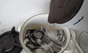 Po wsypaniu soli i sody (pamiętaj, by sól była bez dodatków i nie jodowana, aby uniknąć trudnej do usunięcia białej powłoki na sztućcach), zalewamy sztućce wrzącą wodą. Woda powinna być wrząca, a reakcja sody z wodą wymaga użycia głębokiego naczynia.