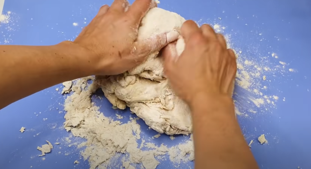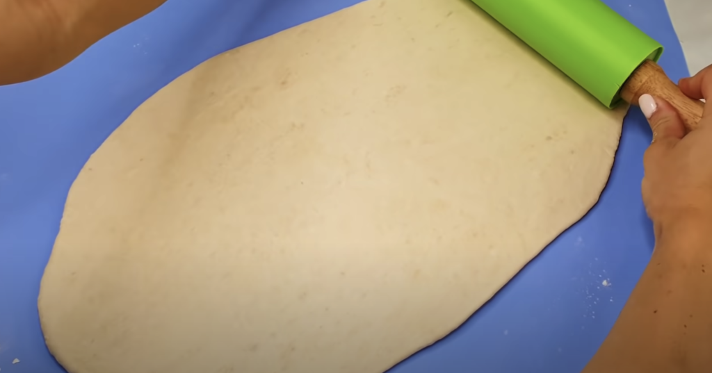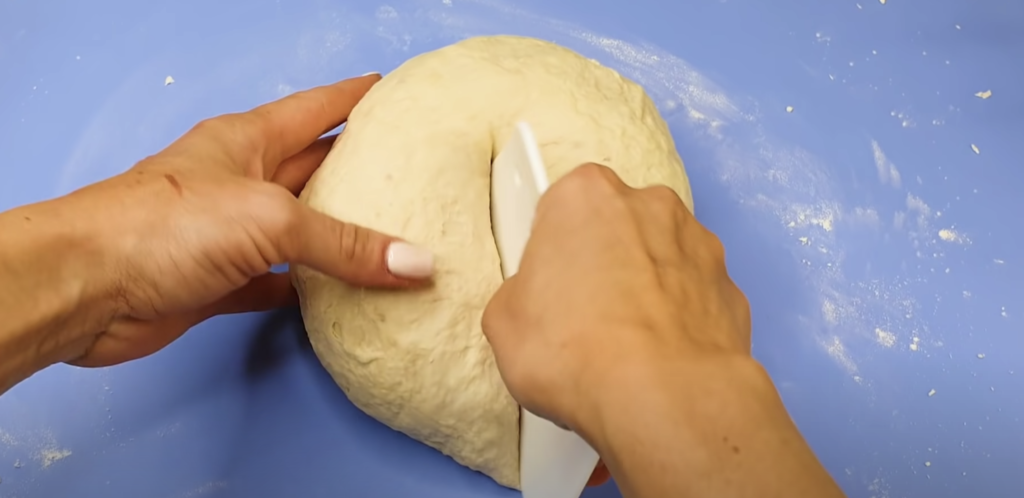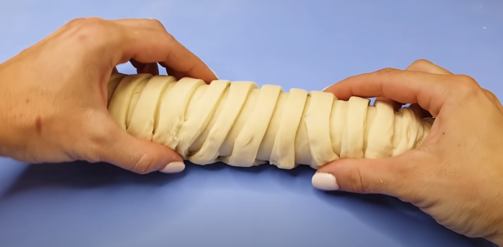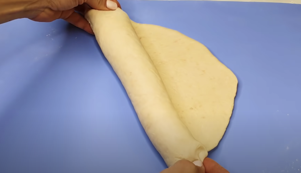 Ciasto dzielimy na 2 części. Zwiń jedną część w owal, ale nie do końca.