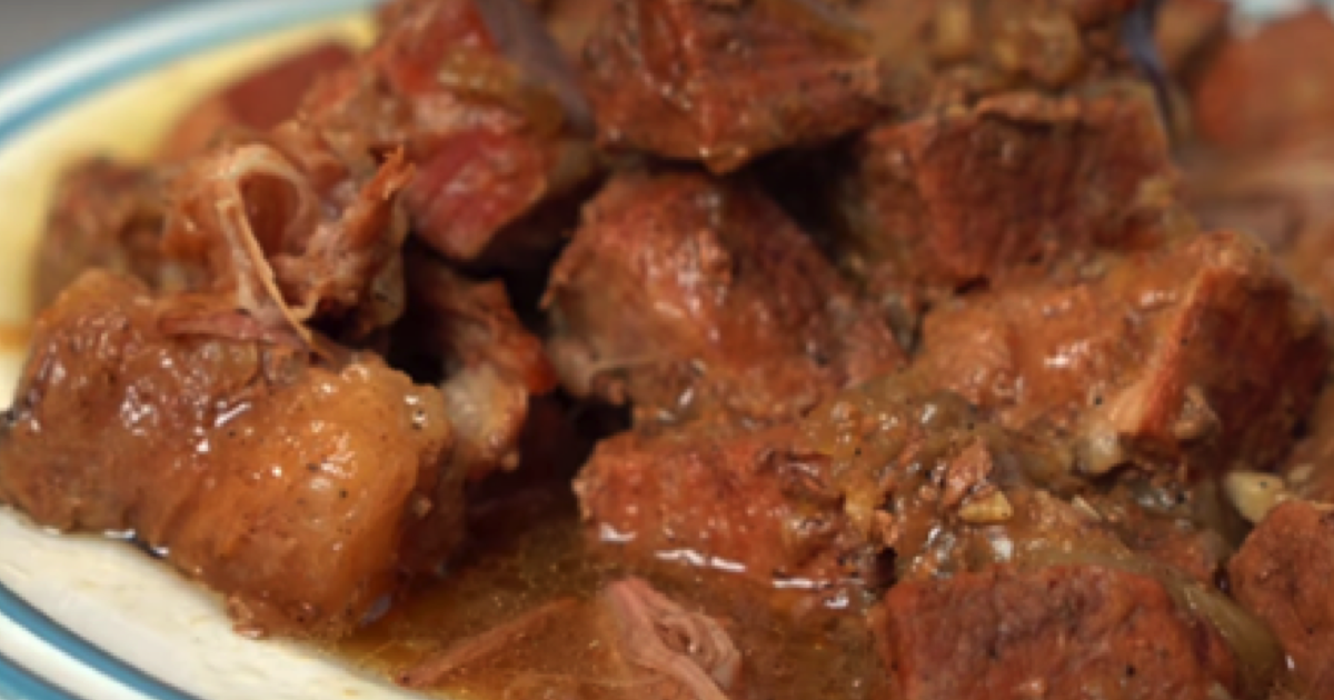 Mięso należy przygotować, dokładnie umyć i osuszyć ręcznikiem papierowym. Mięso pokroić na duże kawałki i przenieść do garnka. Cebulę pokroić na pół i umieścić na dnie garnka.