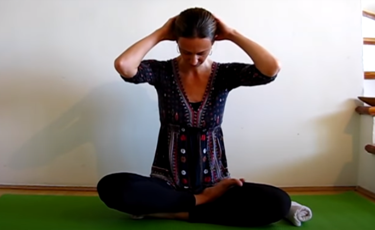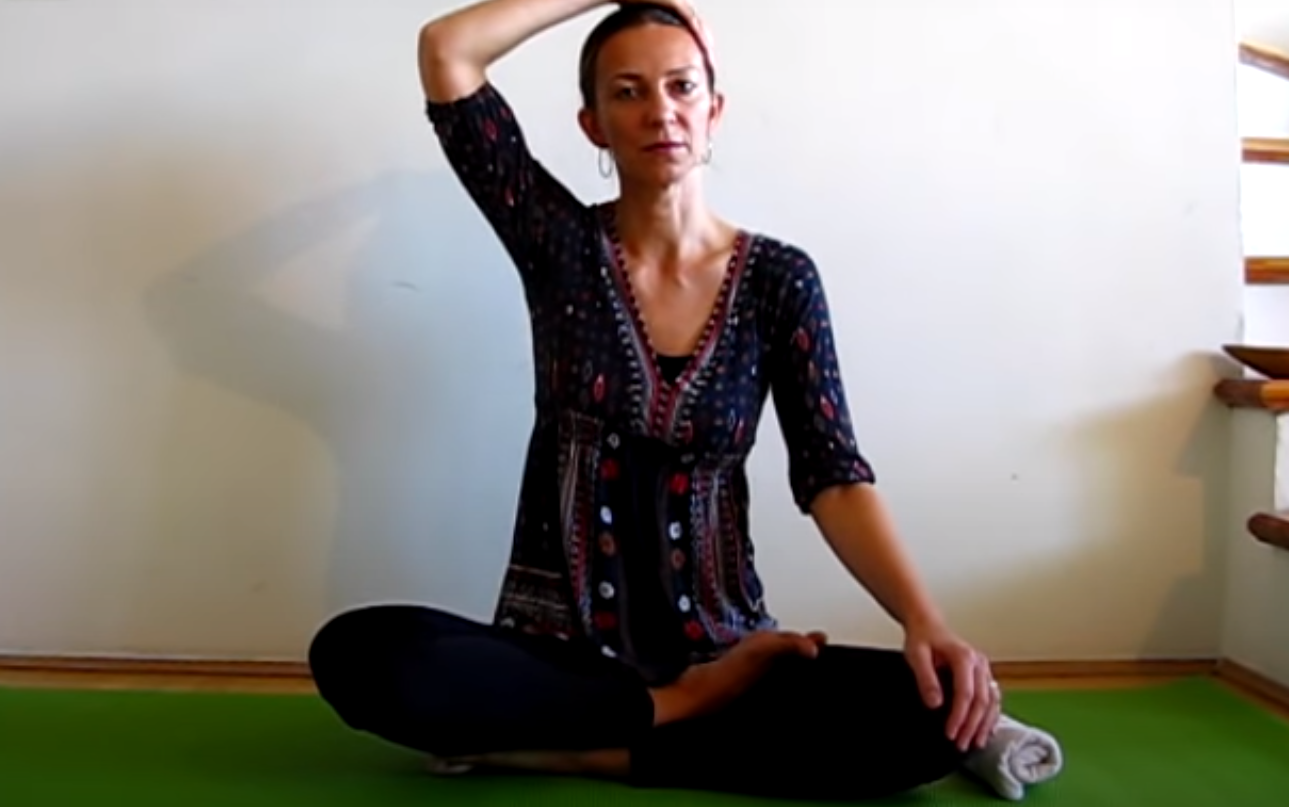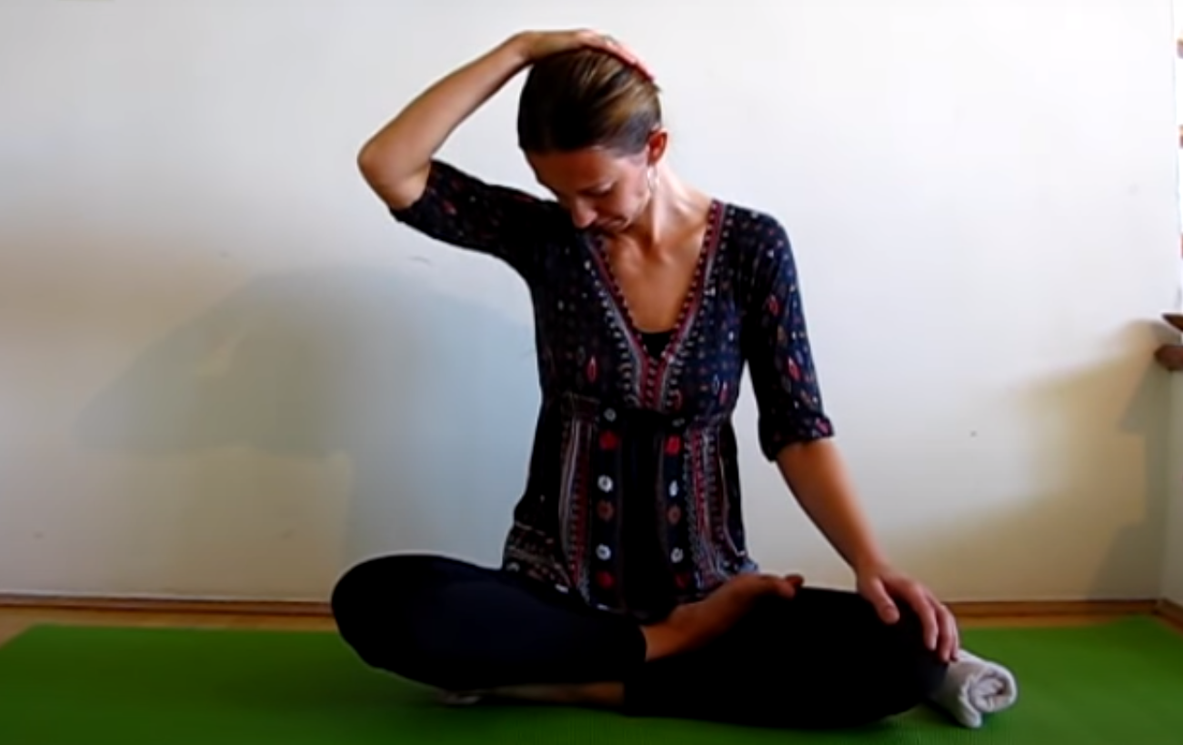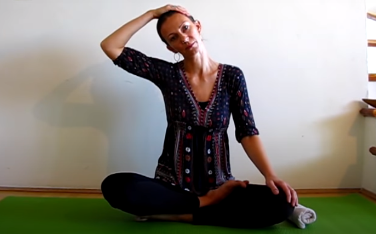 Nadal pozostań w poprzedniej pozycji. Podnieś prawą rękę przyłóż dłoń po lewej stronie głowy na wysokości skroni. Zrób głęboki wydech i powtórz 5 razy. Z kolejnym wydechem przechyl głowę w prawą stronę.
