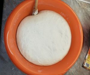 Po wymieszaniu i połączeniu dodać suche drożdże. Bezpośrednio do miski przesiej 500 g mąki. Ciasto trochę wymieszaj, a następnie dodaj olej roślinny. Na koniec ciasto powinno być miękkie i nieklejące się – w razie potrzeby dodać mąkę lub wodę ziemniaczaną. Nasmaruj ciasto odrobiną oleju roślinnego.
