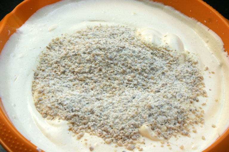 Najpierw należy ubić jajka z cukrem. Żółtka jaj dodajemy do białek i nie przestajemy mieszać całości. Jako ostatnią dokładamy mąkę i orzechy.