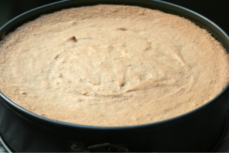 Wymieszaną całość przekładamy do formy do pieczenia, najlepiej okrągłej o średnicy około 25 centymetrów. Forma musi być wyłożona papierem do pieczenia. Ciasto wkładamy do piekarnika.
