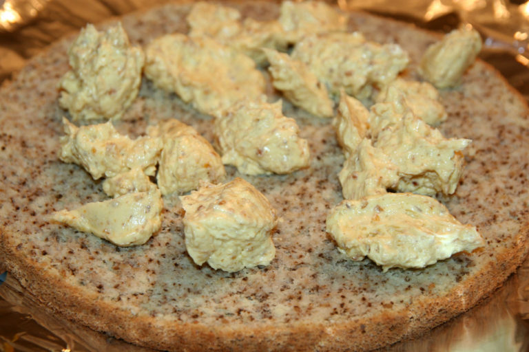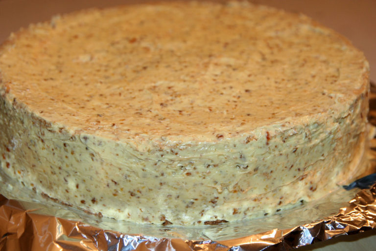 Ostatnim etapem jest stworzenie całości. Pierwszą część ciasta smarujemy syropem, potem kładziemy jedna trzecią kremu. W identyczny sposób postępujemy z pozostałymi częściami ciasta. Górę deseru oraz jego boki także należy posmarować kremem i z każdej strony posypać orzechami.