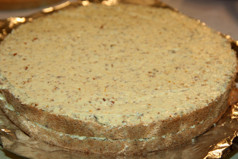 Ostatnim etapem jest stworzenie całości. Pierwszą część ciasta smarujemy syropem, potem kładziemy jedna trzecią kremu. W identyczny sposób postępujemy z pozostałymi częściami ciasta. Górę deseru oraz jego boki także należy posmarować kremem i z każdej strony posypać orzechami.
