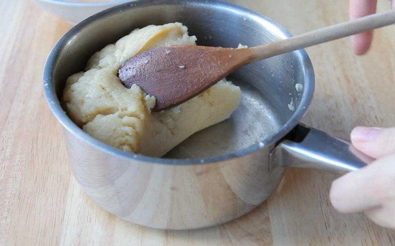 Przesiej mąkę przez sitko, dzięki czemu uzyskasz bardziej gładką masę. Równolegle, w małym rondlu, na średnim ogniu, zagotuj 250 ml wody z masłem. Do gotujących się składników, dodaj wcześniej przesianą mąkę i cały czas mieszając, przygotuj jednolite kremowe ciasto.