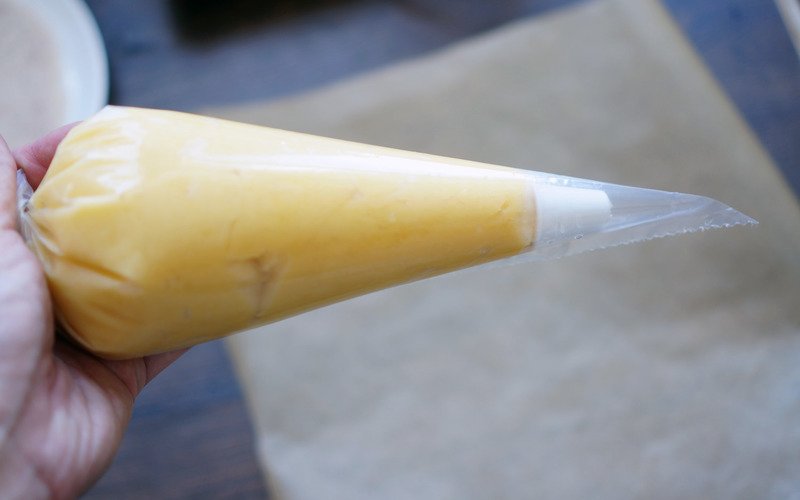 Zdejmij zagotowaną masę z ognia i dodaj do lekko wystudzonej jajko. Tu najistotniejsze jest dodawanie każdego oddzielnie i dokładne wymieszanie, tak aby składniki bardzo dobrze się połączyły. Gdy masa będzie gładka i jednolita, przełóż ją do szprycy cukierniczej.