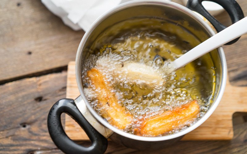 Przygotuj głęboką patelnię, albo garnek, do którego wlejesz olej słonecznikowy. Dobrze go rozgrzej. Gdy osiągnie właściwą temperaturę, bezpośrednio ze szprycy, wyciskaj do rozgrzanego tłuszczu, „makaroniki” z ciasta.