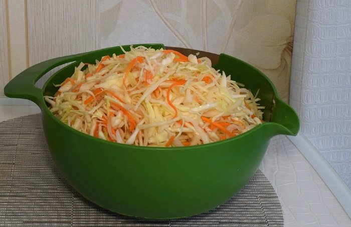 Cebulę pokrój w pierścienie. kapustę posiekaj. Marchewkę zetrzyj na tarce o grubych oczkach. Wymiesza wszystko razem, dopraw solą i ponownie wymieszaj. Dodaj olej słonecznikowy.