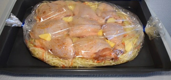 Warzywa umieść w specjalnym rękawie przeznaczonym do pieczenia. Na wierzchu połóż mięso i dodaj masło. Rozgrzej piekarnik do temperatury 200 stopni. Piecz danie około 45 minut, zależnie od piekarnika.
