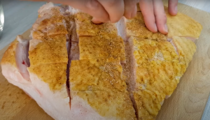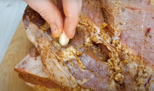 Tą mieszanką mięso posypujemy wszędzie, od dołu, od góry, a także w nacięciach. Kilka nacięć wycinamy, wkładamy w nie ząbki czosnku.