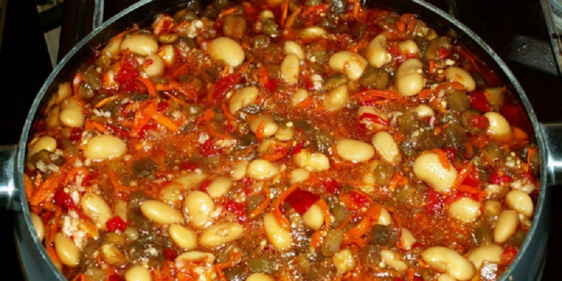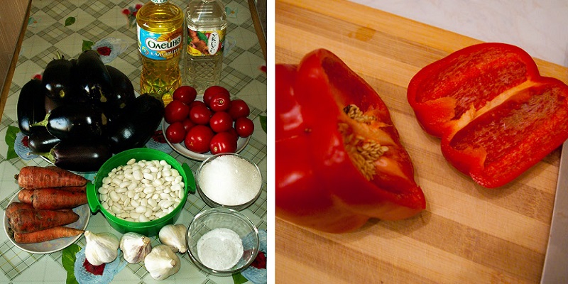 Fasolę najpierw namoczyć, a następnie ugotować. Bakłażany oraz paprykę pokroić w kostkę, a cebulę na półpierścienie. Marchewkę należy zetrzeć na tarce na średniej wielkości oczkach.