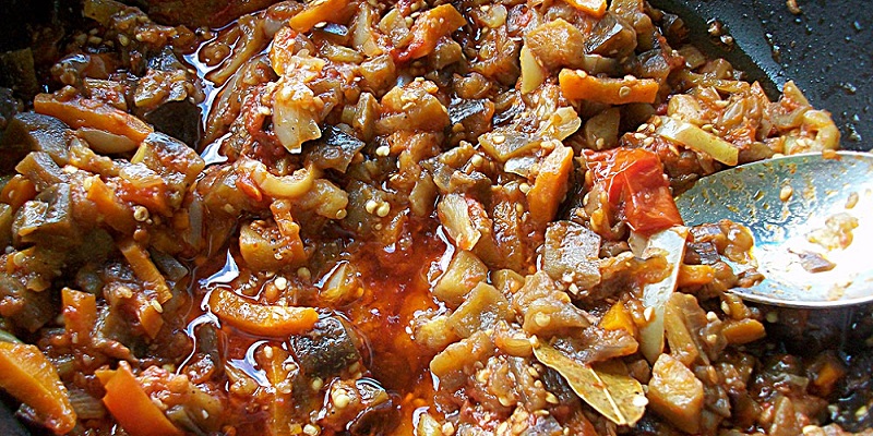 Zioła oraz czosnek drobno posiekać. Pomidory przemielić przez maszynkę do mięsa. Cebulę zeszklić na oleju i dodać do niej marchewkę. Do głębokiego garnka włożyć paprykę oraz bakłażan.