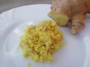 - Oczyść czosnek i przeciśnij go do miski. Imbir obierz łyżką stołową i zetrzyj na drobno.