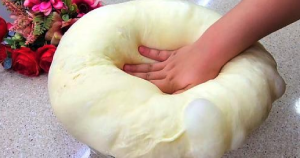 Wyrośnięte ciasto wyrób na stole, formując duże koło. Posmaruj masłem, złóż w trzy części.