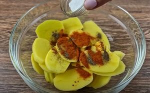 Pokrój ziemniaki w plastry o grubości nie większej niż pół centymetra. W misce wymieszaj je z solą, pieprzem, słodką papryką i olejem roślinnym. Dokładnie wymieszaj, aby ziemniaki dokładnie pokryły się przyprawami i olejem.