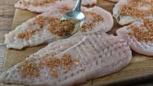 Większe kotlety z kurczaka przekrój wzdłuż na pół, aby były cieńsze, a następnie rozbij je. Przygotuj mieszankę soli, czarnego pieprzu, włoskich ziół i słodkiej papryki i dopraw nią plastry mięsa. Włóż olej roślinny, jajka, ocet, musztardę i czosnek do miski i ubij majonez ręcznym mikserem.