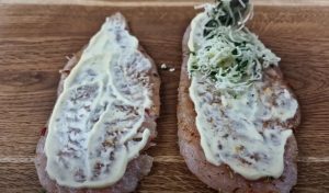 Natkę pietruszki i 2 ząbki czosnku drobno posiekać i wszystko razem wymieszać. Następnie zetrzyj ser i podziel go na pół. Wymieszaj połowę z pietruszką i czosnkiem. Rozłóż mieszankę majonezu po jednej stronie plastrów, zachowując około połowy mieszanki. Mięso posyp mieszanką serową z natką pietruszki i czosnkiem i zwiń w roladki.