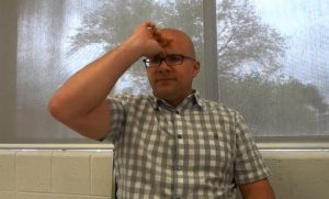 Język unieś do góry i dociskaj go do podniebienia. Jednocześnie uciskaj miejsce pomiędzy brwiami. Możesz to zrobić kciukiem lub palcem wskazującym.