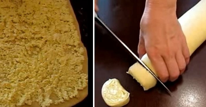 Ciasto rozwałkowujemy na prostokąt o grubości ok. 1 cm. Wykładamy na nie nadzienie twarogowe, a potem zwijamy je w rulon. Następnie kroimy go na niezbyt grube części.