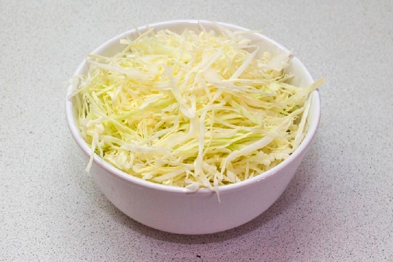 Jako pierwszą szatkujemy kapustę (siekamy na małe, drobne paski), marchewkę kroimy na małe paski lub ewentualnie ścieramy na tarce o dużych oczkach.