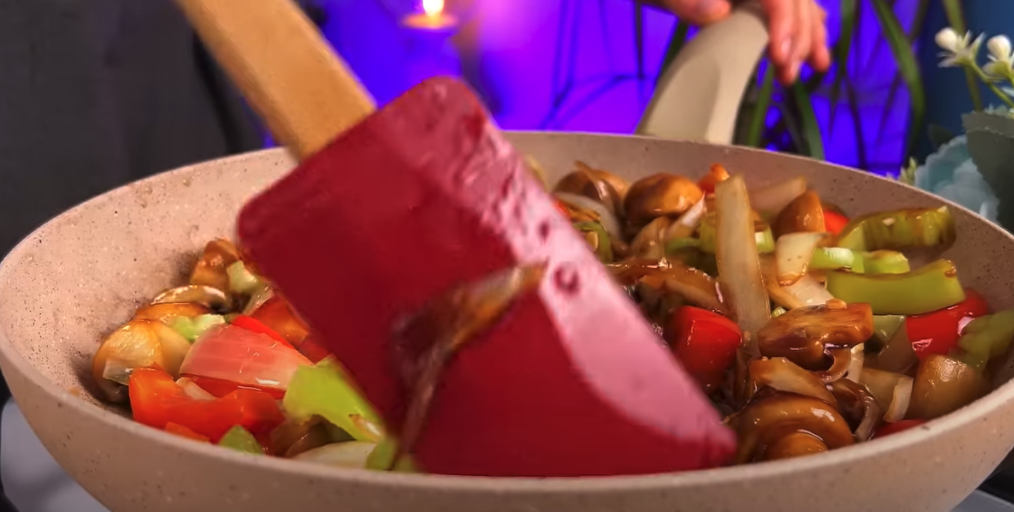 Na patelni rozpuśćcie 20 g masła z odrobiną oliwy z oliwek. Posiekajcie 250 g grzybów i smażcie je na złoty kolor ze wszystkich stron. Dodajcie pokrojoną cebulę, 1/2 czerwonej papryki, 1 zieloną paprykę oraz 1/2 papryczki chili. Całość wymieszajcie, dodając zmiażdżony ząbek czosnku, 2 łyżki sosu sojowego, 1 łyżkę octu ryżowego oraz 1 łyżkę ketchupu. Podsmażajcie warzywa przez minutę, a następnie zdejmijcie z ognia. Gotową mieszankę przełóżcie do miski i posypcie świeżo posiekaną pietruszką. Ciepła sałatka grzybowa będzie doskonałym dodatkiem do naszych ziemniaków.