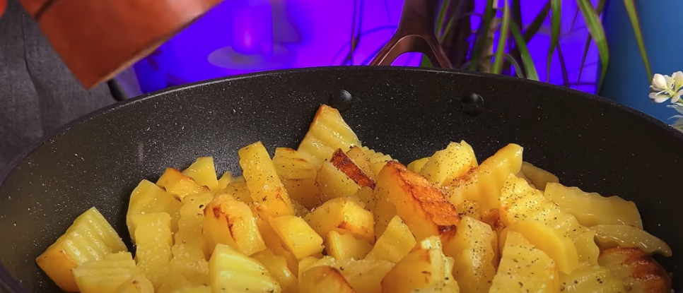 Po upływie 15 minut, osuszcie ziemniaki ręcznikiem papierowym. Na patelni rozgrzejcie olej na średnim ogniu i wrzućcie ziemniaki, smażąc je na złoty kolor. Kiedy będą już chrupiące, posólcie je i doprawcie czarnym pieprzem. Następnie przełóżcie ziemniaki do miski i wlejcie na nie przygotowaną wcześniej masę jajeczną.