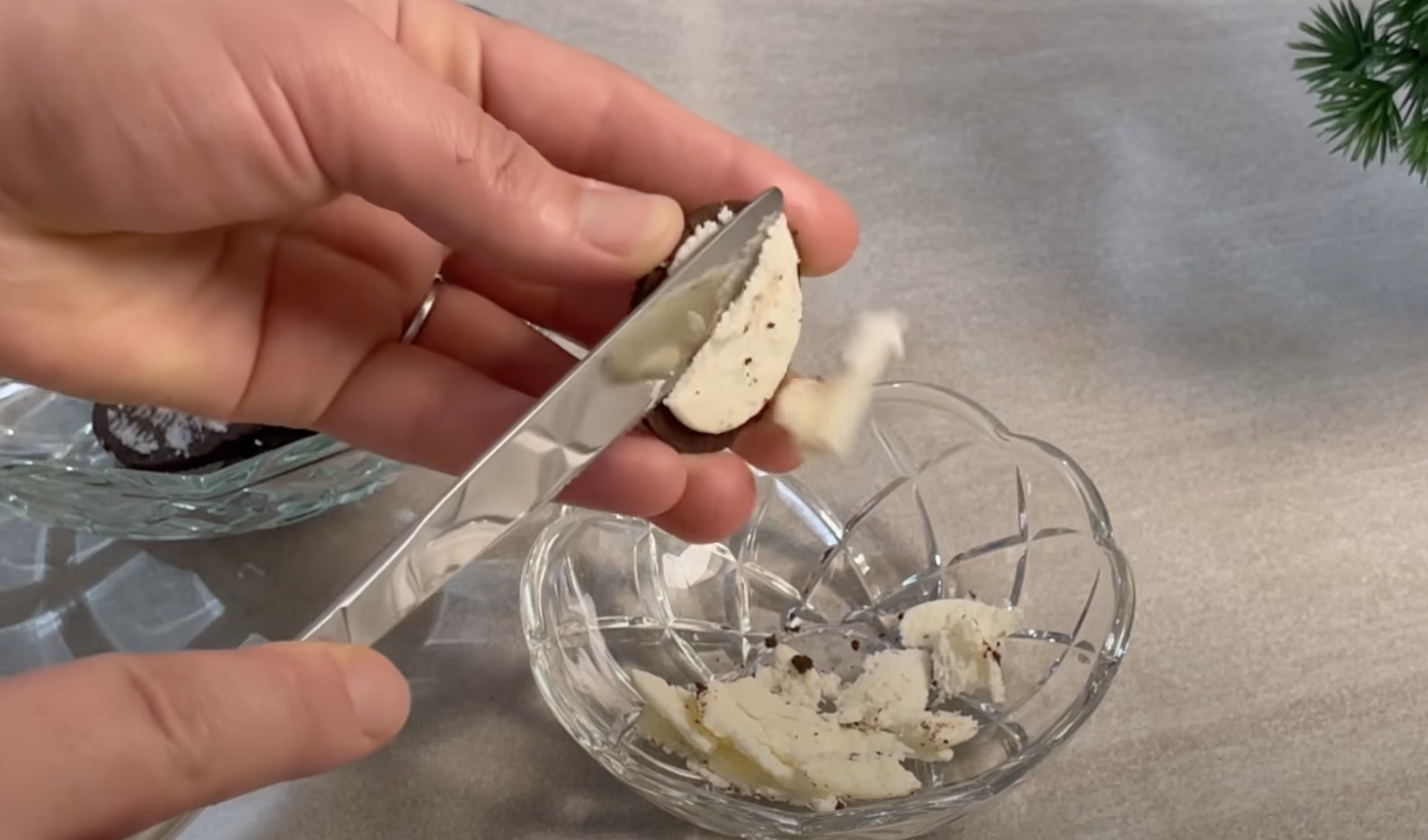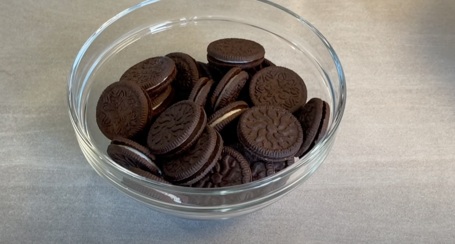 Oddziel krem od ciastek, pokrusz ich czekoladową część.