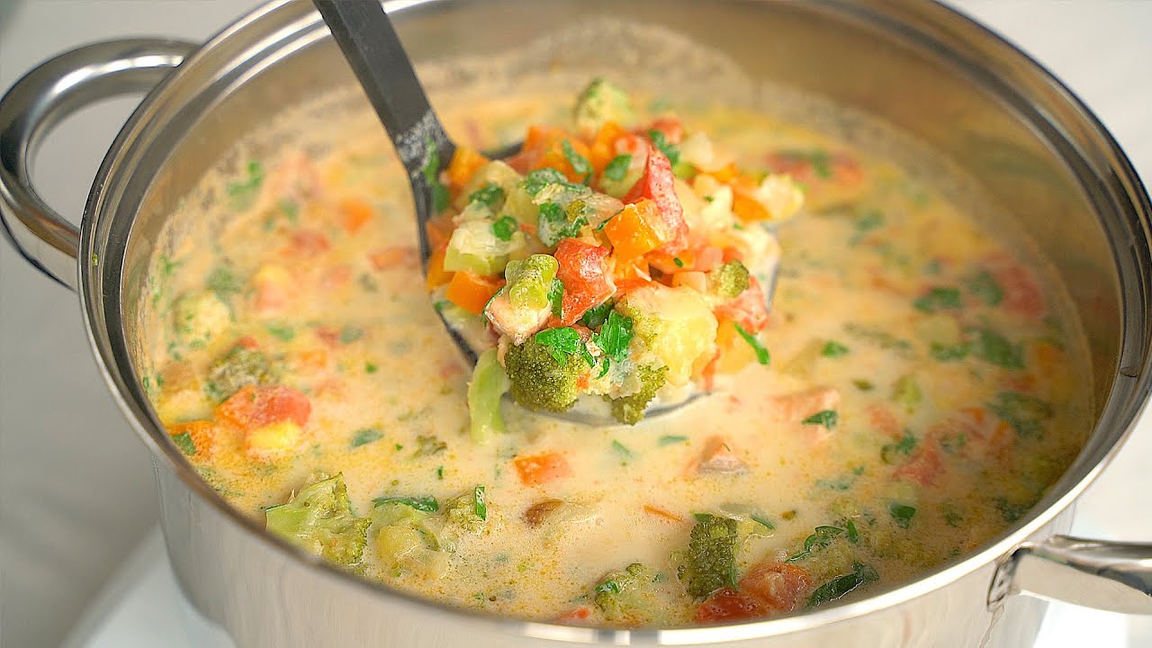 Smaczny przepis na zdrową i pożywną zupę z warzywami, brokułami i łososiem.